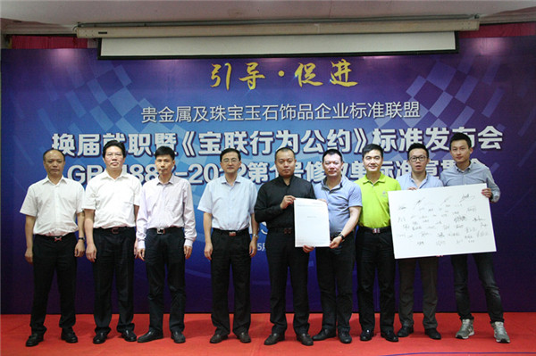 5月15日,贵金属及珠宝玉石饰品企业标准联盟(简称“宝联”)隆重召开“换届就职暨《宝联行为公约》标准发布会、GB11887-2012第1号修改单标准宣贯会”,宝福、甘露、百泰等41家成员单位代表及全国各地100多家大中型珠宝企业代表共200多人出席会议。