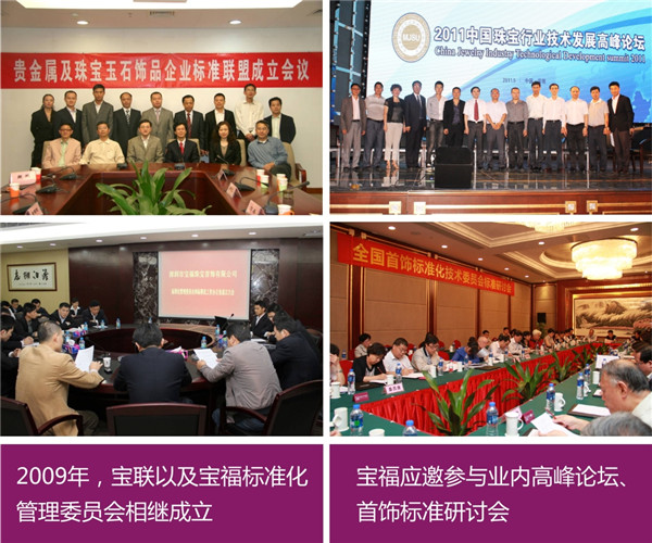 “中国AAAA标准化良好行为企业”宝福公司率先建立了完善的标准体系,建有“技术标准体系”、“管理标准体系”、“工作标准体系”、“法律法规体系”等标准体系,率先通过了ISO9001质量管理、ISO14001环境管理和OHSAS18001职业健康安全管理体系认证,是当时为数不多通过三大体系认证的珠宝企业,在行业标准化进程中树立了先进典范。作为行业资历深厚的老字号,宝福长期坚持标准化建设,积极担起企业和行业的标准发展大任,其标准化工作专业团队参与了多个国家标准、行业标准、地方标准和技术、管理等标准的制定、修订,收集或制定的相关标准达1100多项。宝福是宝联的发起单位之一,时任宝联第一届秘书长单位,现任副主任委员单位,同时担任全国首饰标准化技术委员会委员、广东省贵金属标准化技术委员会委员、深圳市标准化协会第五届理事会单位、龙岗区质量技术协会理事单位等,并自建有标准化管理委员会和标准化工作办公室,已在标准化领域卓有成效和影响力。